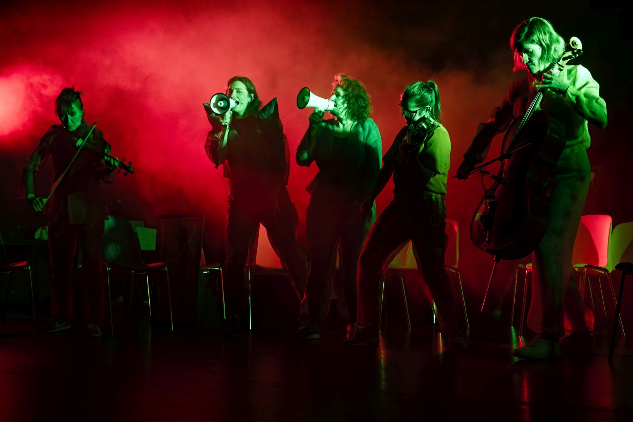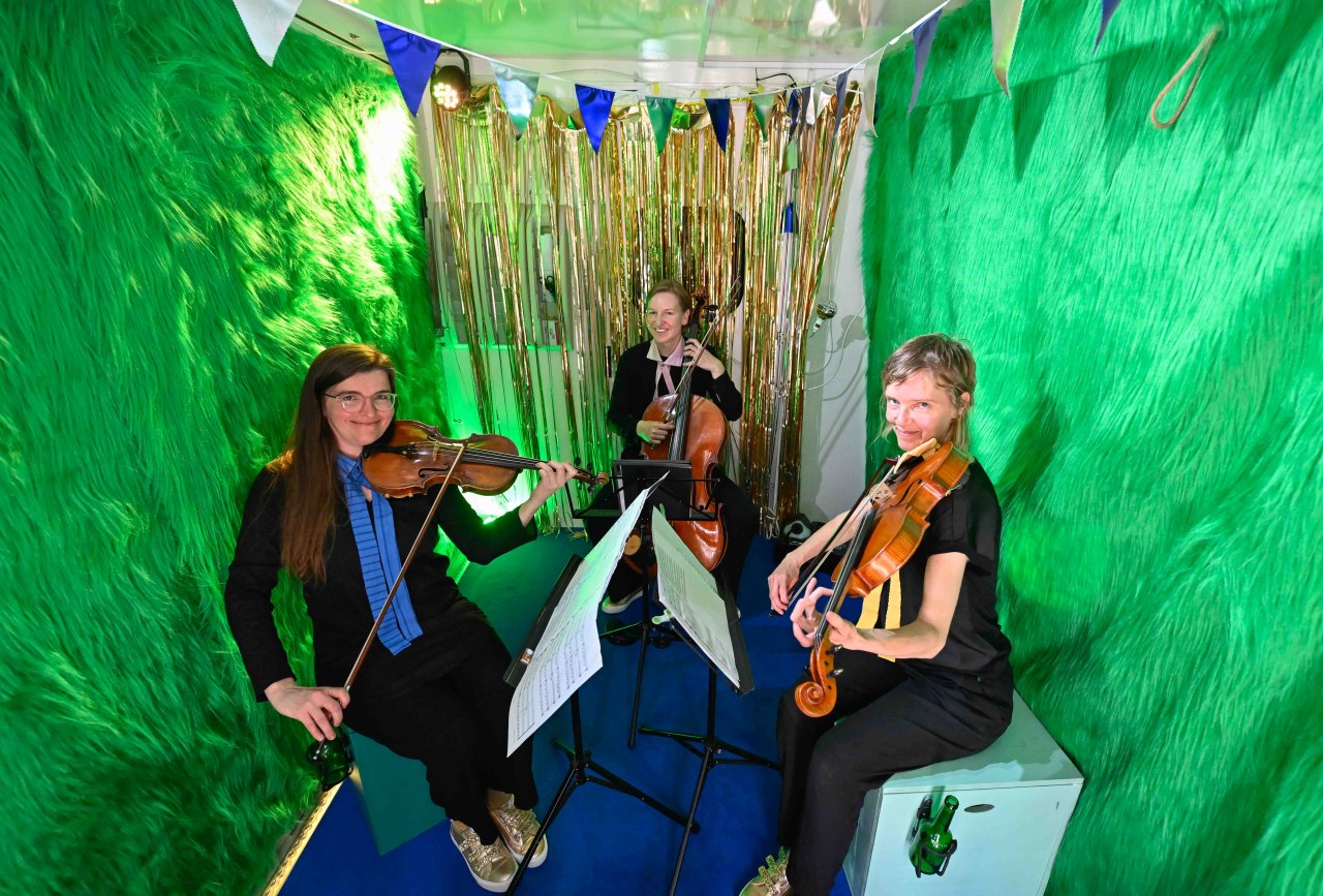 „Das Streichquartett auf seine globale Zeitgenossenschaft testen und proaktiv zur Grenzüber schreitung einladen: Quartett PLUS 1, bestehend aus Kathrina Hülsmann (Viola), Katharina Pfänder (Violine) und Lisa Stepf (Violoncello), realisiert seit 20 Jahren mit wechselnden Gastkünstler:innen transdisziplinäre und kollektive Projekte in der Reibung mit Medien, Räumen und aktuellen Themen. Dazu verbindet das Ensemble Klassik mit Improvisation, Elektrotracks, Soundwalk und Performance.“